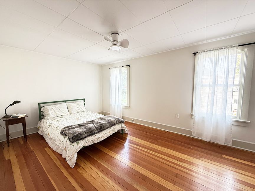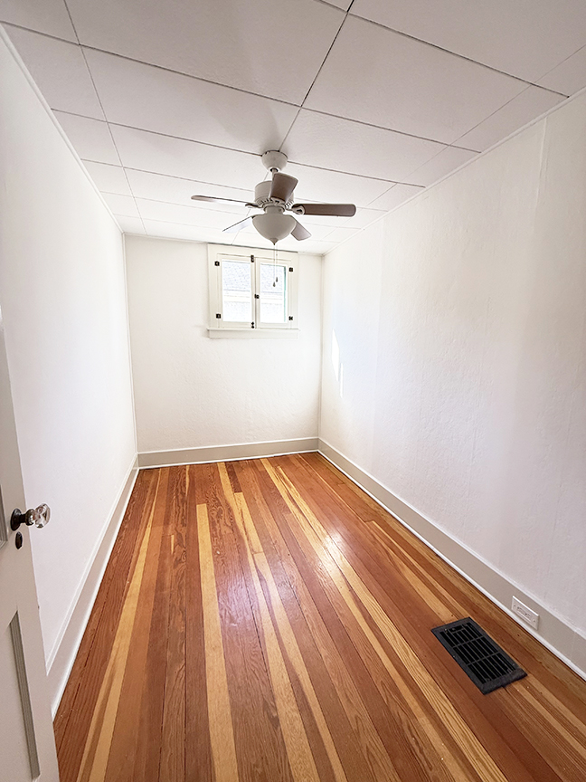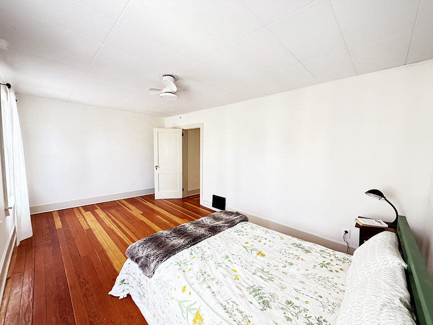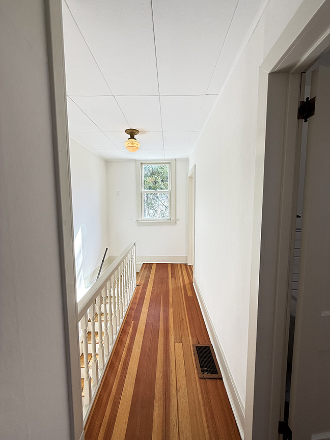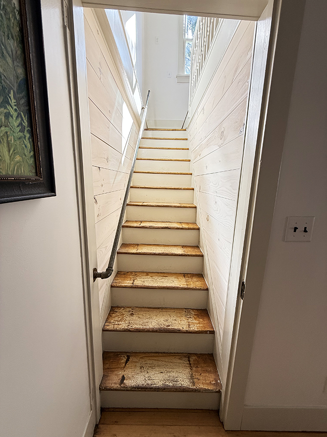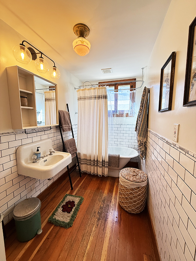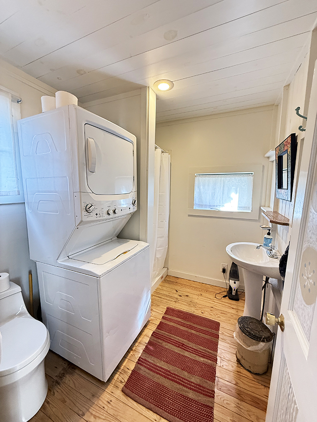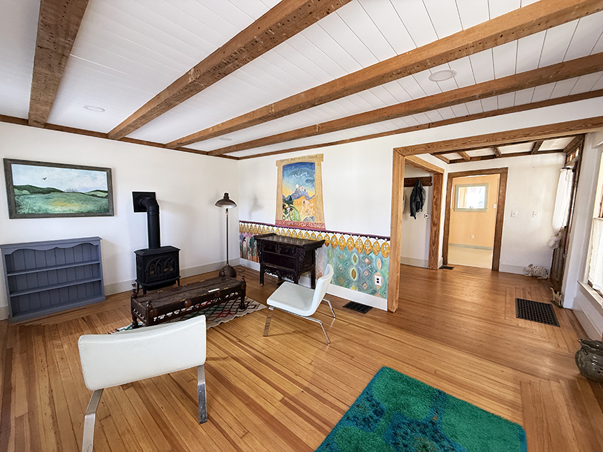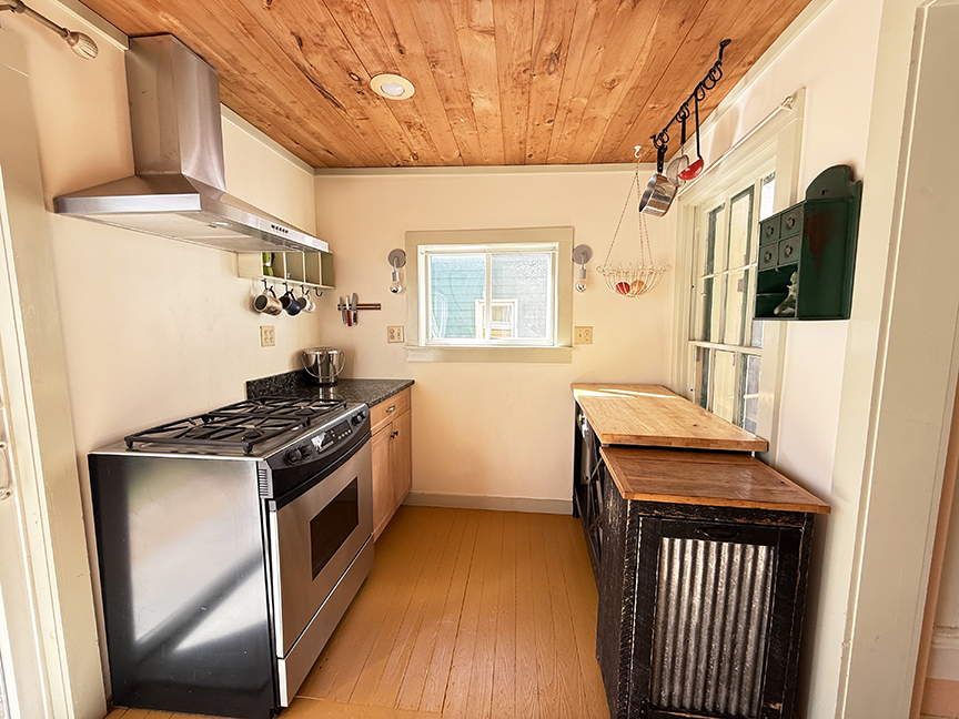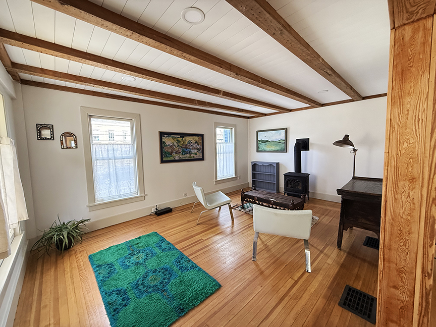 stainless steel appliances and sliding door to garden. Beamed ceilings, wood floors. A local artist was a past tenant, and her delightful murals remain on some walls and over many windows, which add to the charm of this cottage style home. Upstairs are three bedrooms with wood floors, full hall bath with claw foot tub, and ample closets. The basement likely housed a shop or business in the past, and its sidewalk door access remains.