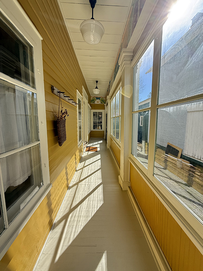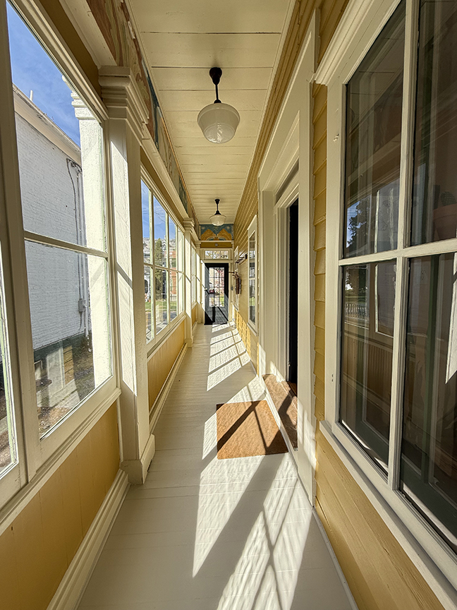car garage. The exterior has a fresh coat of paint, and asphalt shingle and metal roof, and many replacement windows. An enclosed porch along the side of the house is cozy and welcoming. First floor offers a living room with propane stove, sitting room/dining room with original built-ins, ¾ Bath and with laundry, and Kitchen with