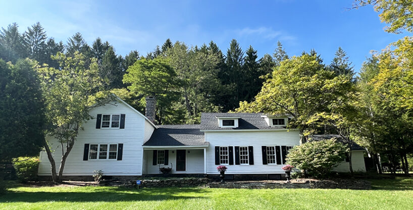 Looking like a Currier and Ives painting, this well-known early 1800’s charmer sits on 11+ acres on a quiet country road, just ten minutes from the Village. Sitting in the midst of lovely lawns with stone walls, trees at the back with a trail to the hill above, a stone frog pond, post and rail fencing as well as a pond across the road, this home offers some 3,875 sq ft of family living space. The early part of the home has pine floors, beamed ceilings, wrought iron hardware, plank wainscotting, interesting built-ins, three fireplaces, and a full bath with laundry, an elegant footed tub and a sauna. This unique property is filled with original detail. The well-done kitchen is recent and has maple cupboards, some glass fronted, pantry area, butcher block countertops and tile floor. Off the family room is the “snug” which houses a stone fireplace with the stone extending into the room, wrought iron crane, brick floor and an arched doorway which leads to the downstairs bedrooms, and baths. There is a dining room with door to the stone front porch. The back door, most often used for entry, has the original hardware. Mostly 6/6 windows throughout. In the 1960s an addition was added with a front to back living room, carpeted, with a wall of built-ins including two bookcases which pull out with hidden areas behind them which house the TV and electronics. A large screened porch is attached. This opens out onto a stone patio with built-in benches, perfect for summer party overflow. Upstairs the original two bedrooms with wide pine floors connect to the addition through a Harry Potter type hallway with a wall of built-in closets and cupboards. Two bedrooms on this side each offer two bunks and plenty of closet space. There is a full bath in between. Front and back staircases. Four-year-old roof, new septic, new water pump, new hot water heater. At the back of the lawn sits a darling one room playhouse with heat and electricity. The driveway has been recently redone, and drainage added. It winds around to the 1987 barn which can be used for parking, has loft storage, an attached dog enclosure and the perfect get-away room with bunks and a red pot- belly wood stove. This property is very special and will delight the old house