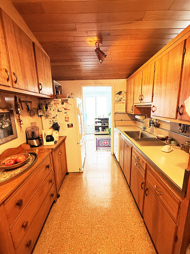 flowing to an efficient galley kitchen where cooking becomes part of the gathering, and out to a